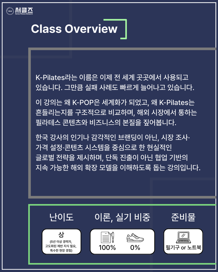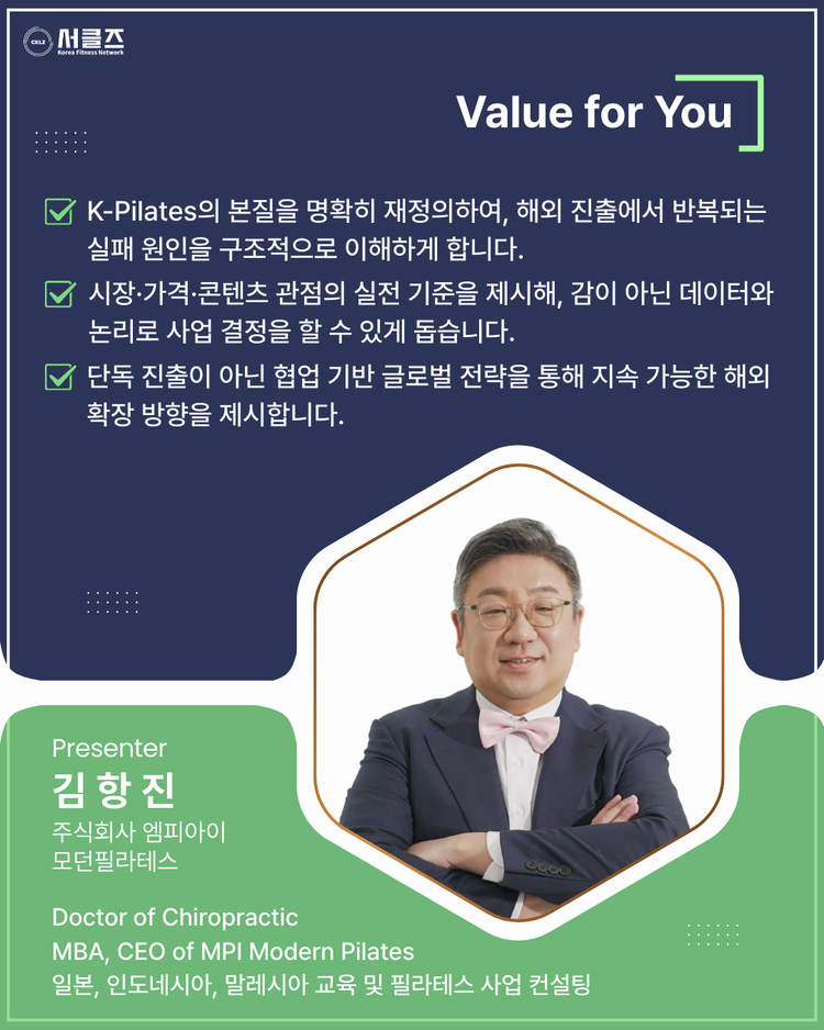 "K-Pilates는 K-POP 다음이 될 수 있을까? - 가능성, 그리고 지금 해외에서 실패가 반복되는 이유" / 김항진 / 03.28(토) / 12:40~14:10 / COEX E홀
