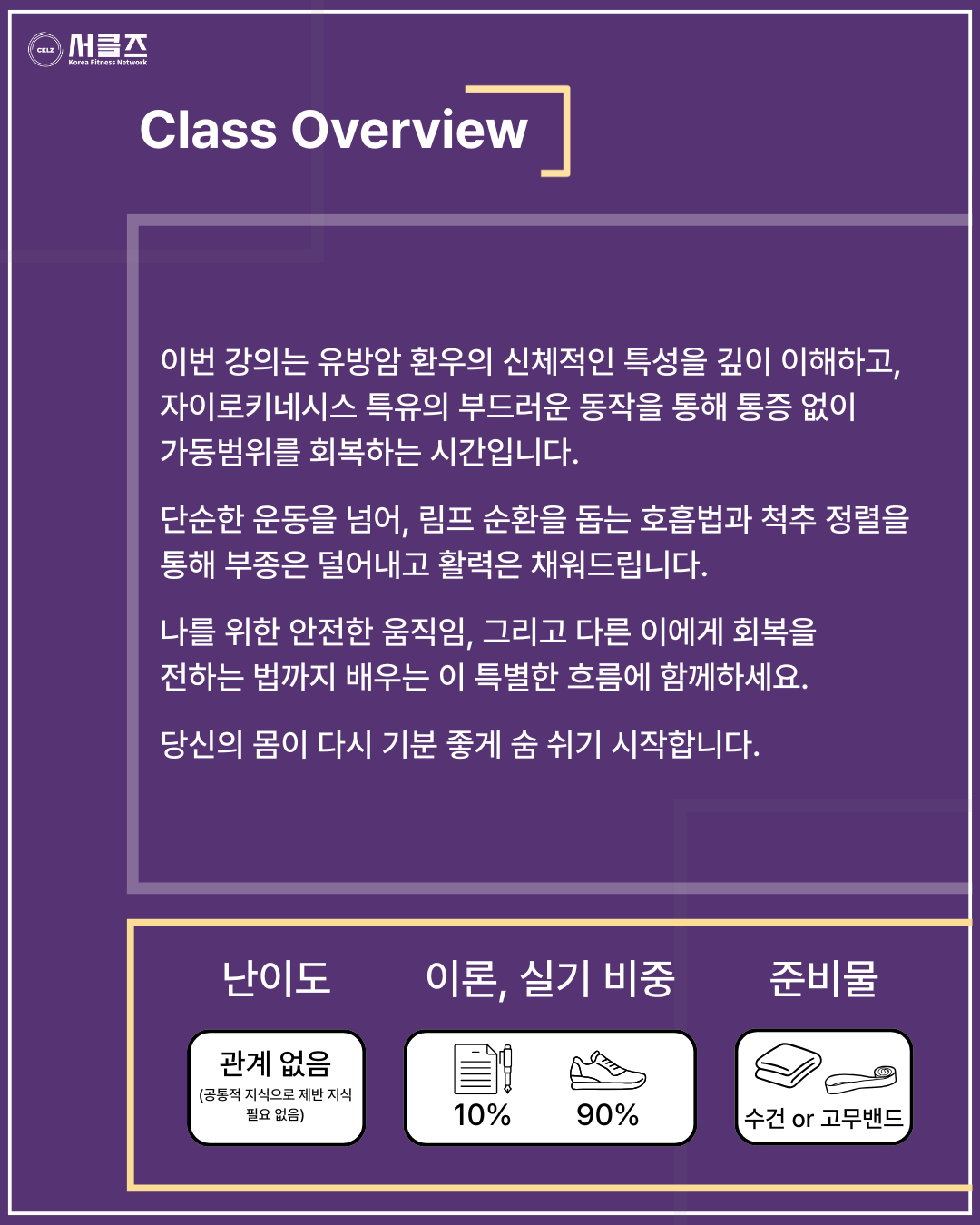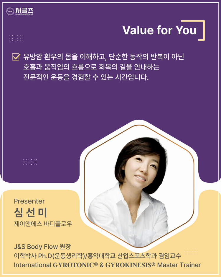 멈춘 흐름을 깨우다 : 유방암 환우를 위한 자이로키네시스 / 심선미 / 03.28(토) / 10:50~12:20 / COEX E홀