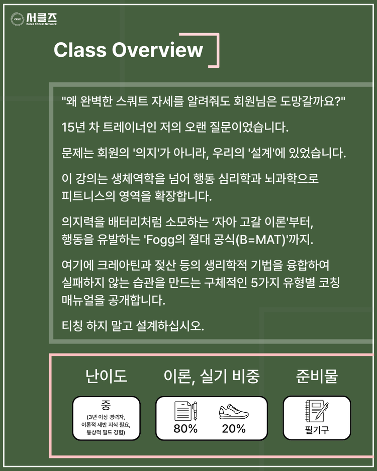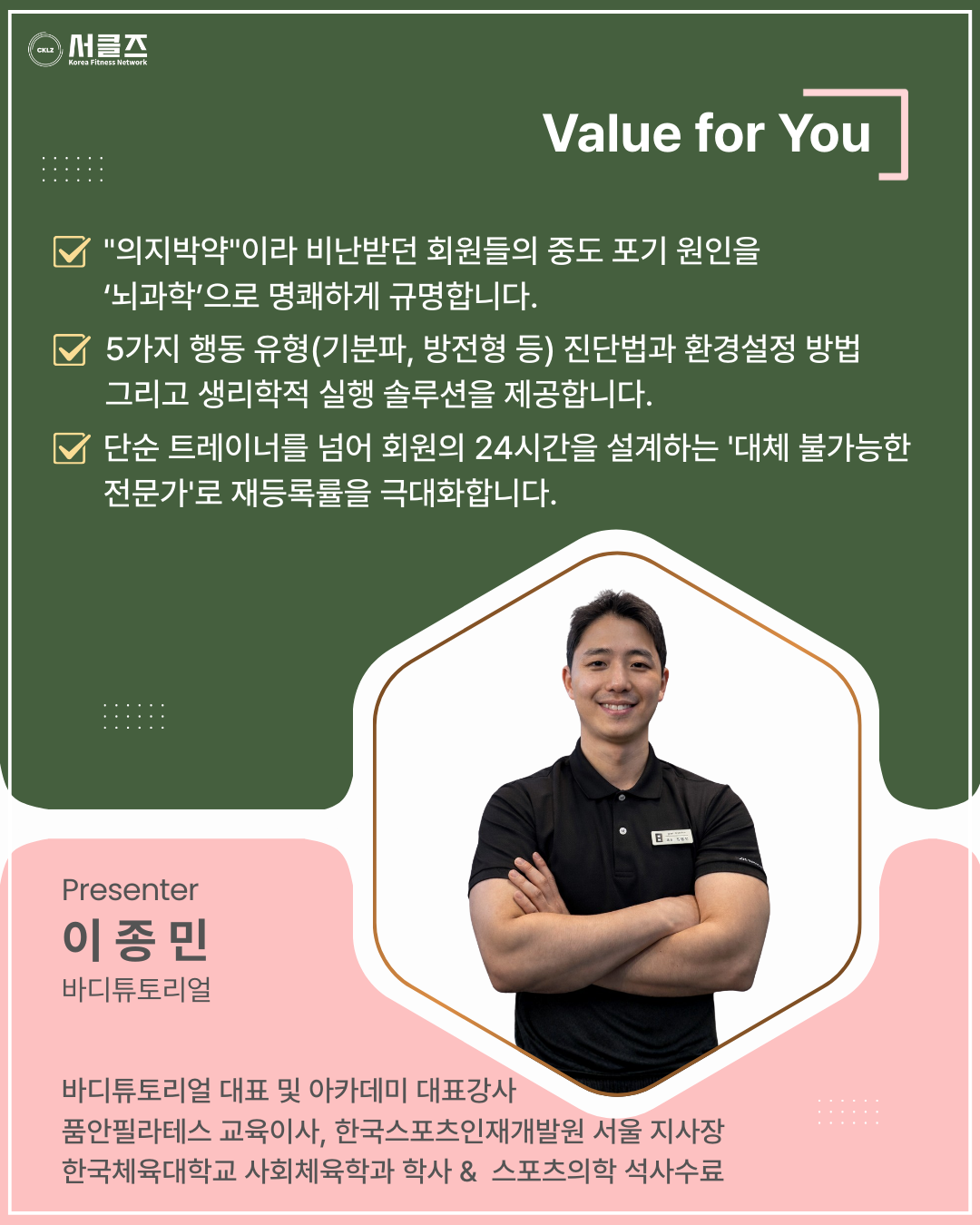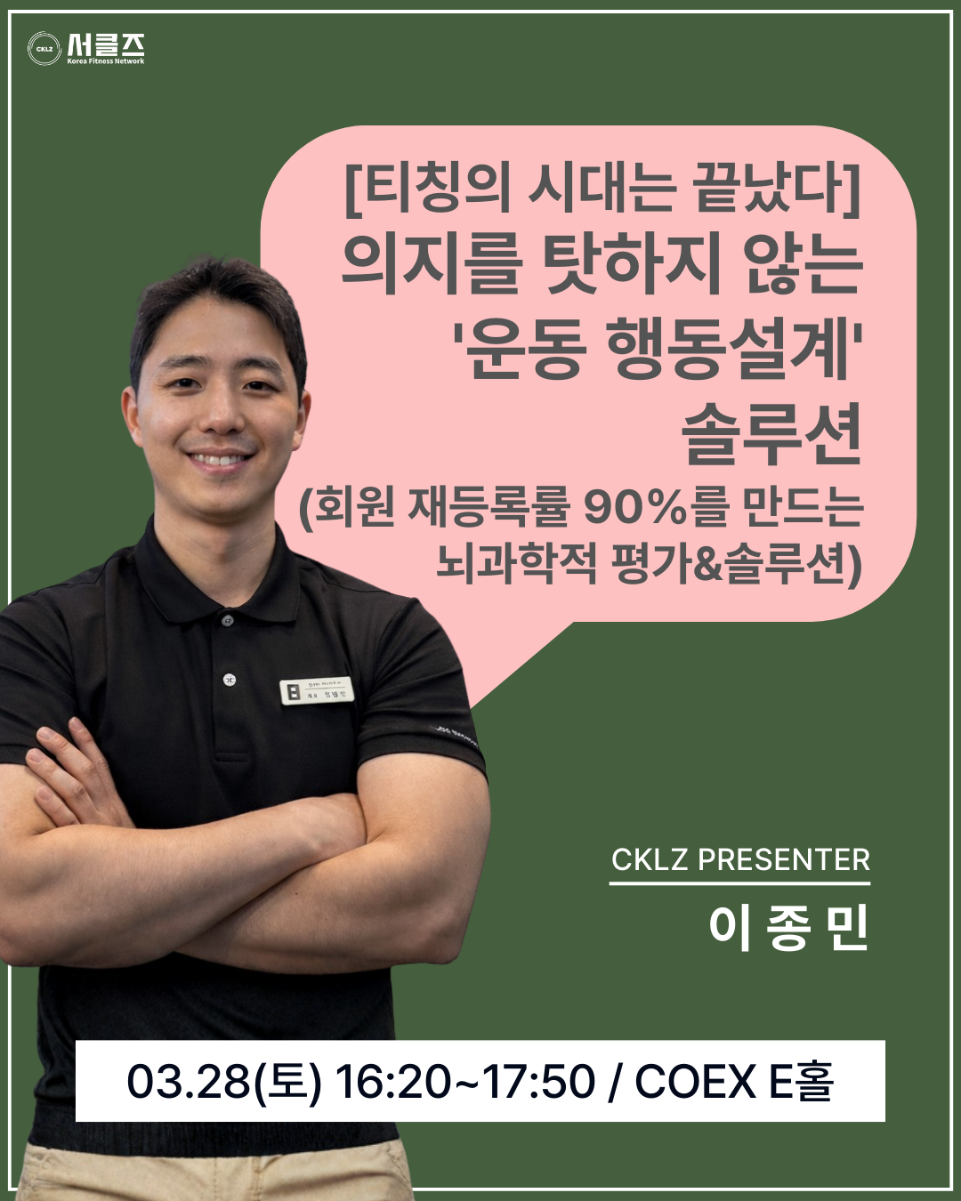 [티칭의 시대는 끝났다] 의지를 탓하지 않는 '운동 행동설계' 솔루션 (회원 재등록률 90%를 만드는 뇌과학적 평가&솔루션) / 이종민 / 03.28(토) / 16:20~17:50 / COEX E홀